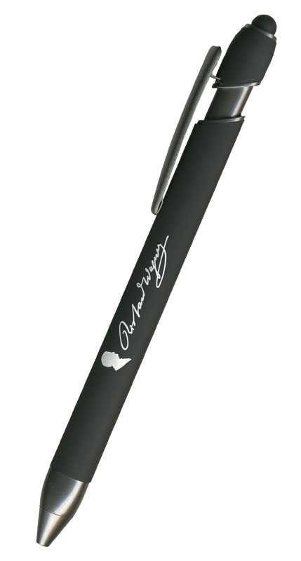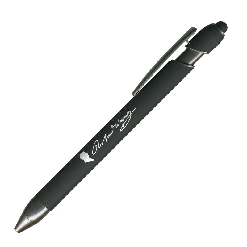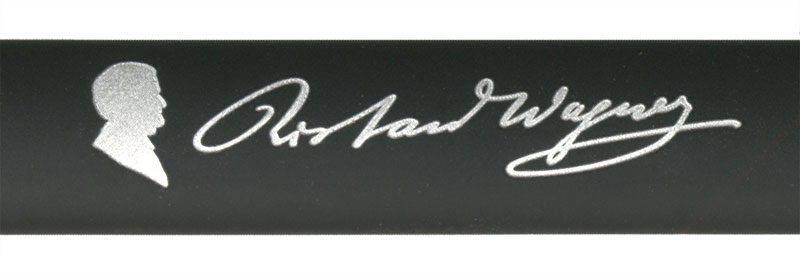 Das matte, schwarze Metallgehäuse liegt angenehm in der Hand und sorgt für ein besonders geschmeidiges Schreibgefühl. Veredelt wird der Kugelschreiber durch einen feinen Schattenriss von Richard Wagner sowie seine elegante Signatur – ein dezentes, aber ausdrucksstarkes Detail für Liebhaber klassischer Musik.